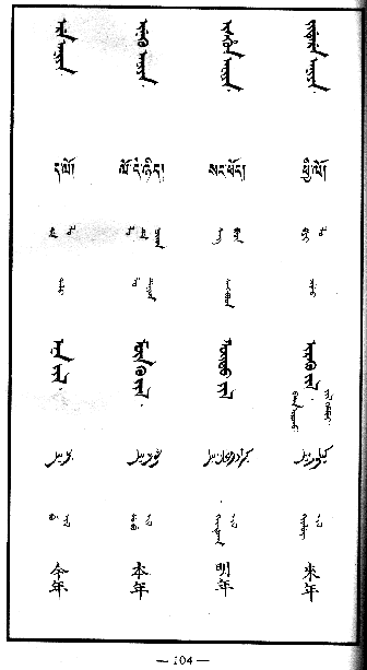 The following image shows one page (page 104) of the 1957 Beijing reprint of the Pentaglot. Each lemma fills one column, and four columns fill one page. Within each column, the languages are arranged in the following order: